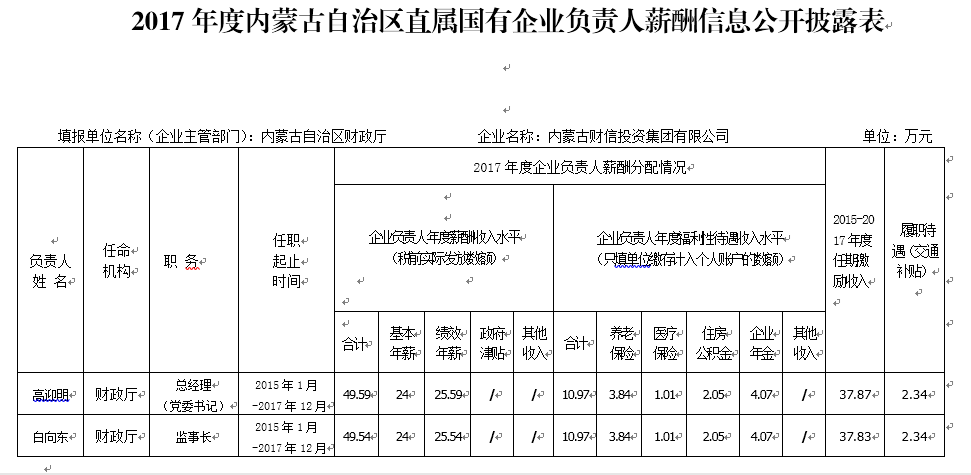 2017年度內(nèi)蒙古自治區(qū)直屬國有企業(yè)負(fù)責(zé)人薪酬信息公開披露表