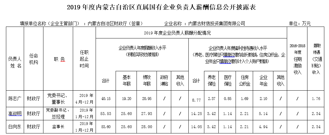 2019年度內(nèi)蒙古自治區(qū)直屬國有企業(yè)負(fù)責(zé)人薪酬信息公開披露表